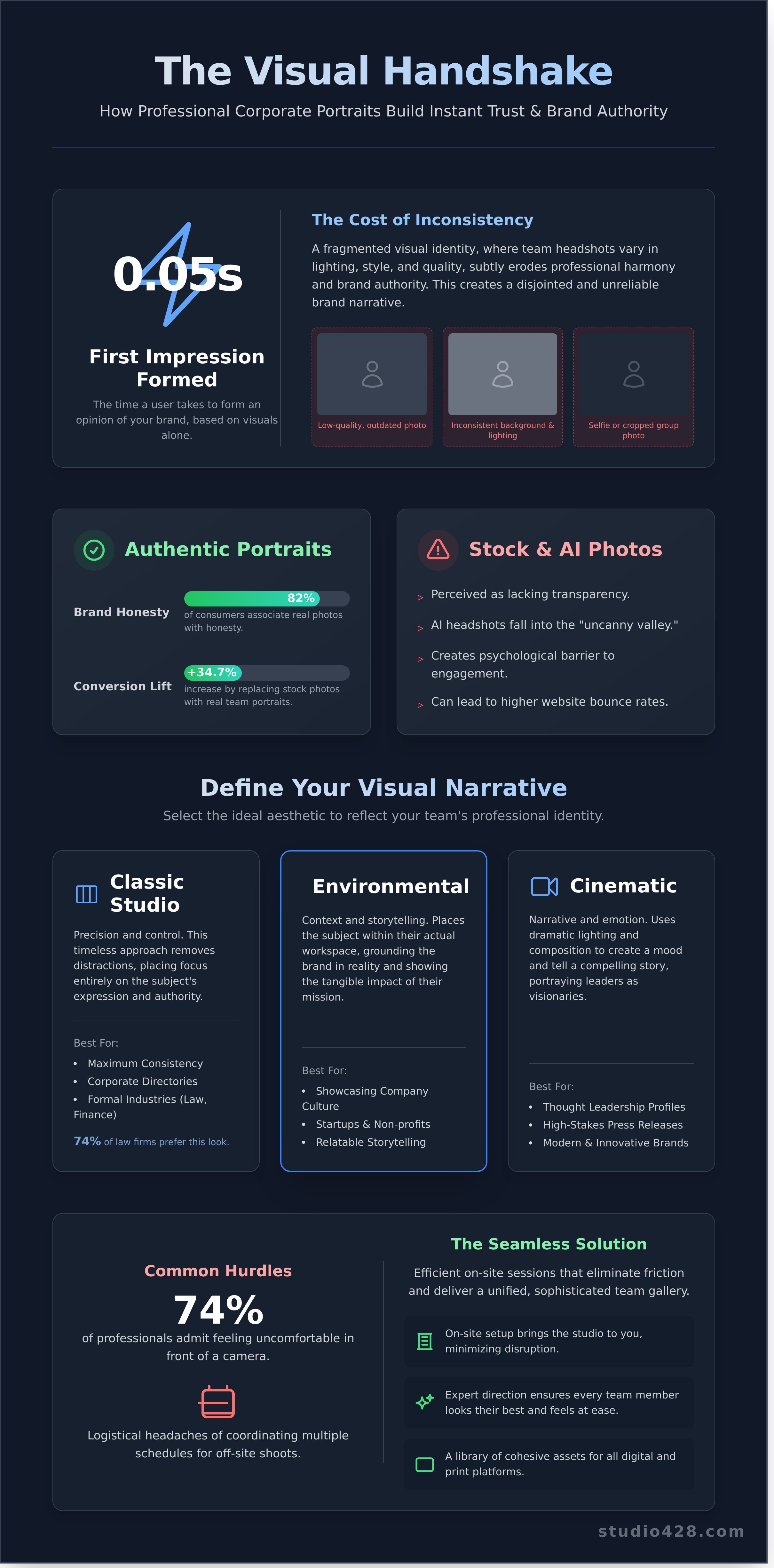What if the most influential architectural element of your brand isn't your office layout, but the light and shadow captured in a single frame? Research from the Missouri University of Science and Technology indicates that users form a first impression of a brand in just 0.05 seconds, focusing primarily on the human faces that represent your mission. You likely recognize that a fragmented visual identity, where executive headshots vary in lighting and tone, subtly erodes the professional harmony you've worked to build. It's a logistical headache to coordinate twenty different schedules for an off-site shoot, and 74% of professionals admit they feel uncomfortable in front of a lens, fearing a result that's stiff or overly clinical. Investing in high-quality corporate portrait photography shouldn't feel like a compromise between your time and your aesthetic standards.