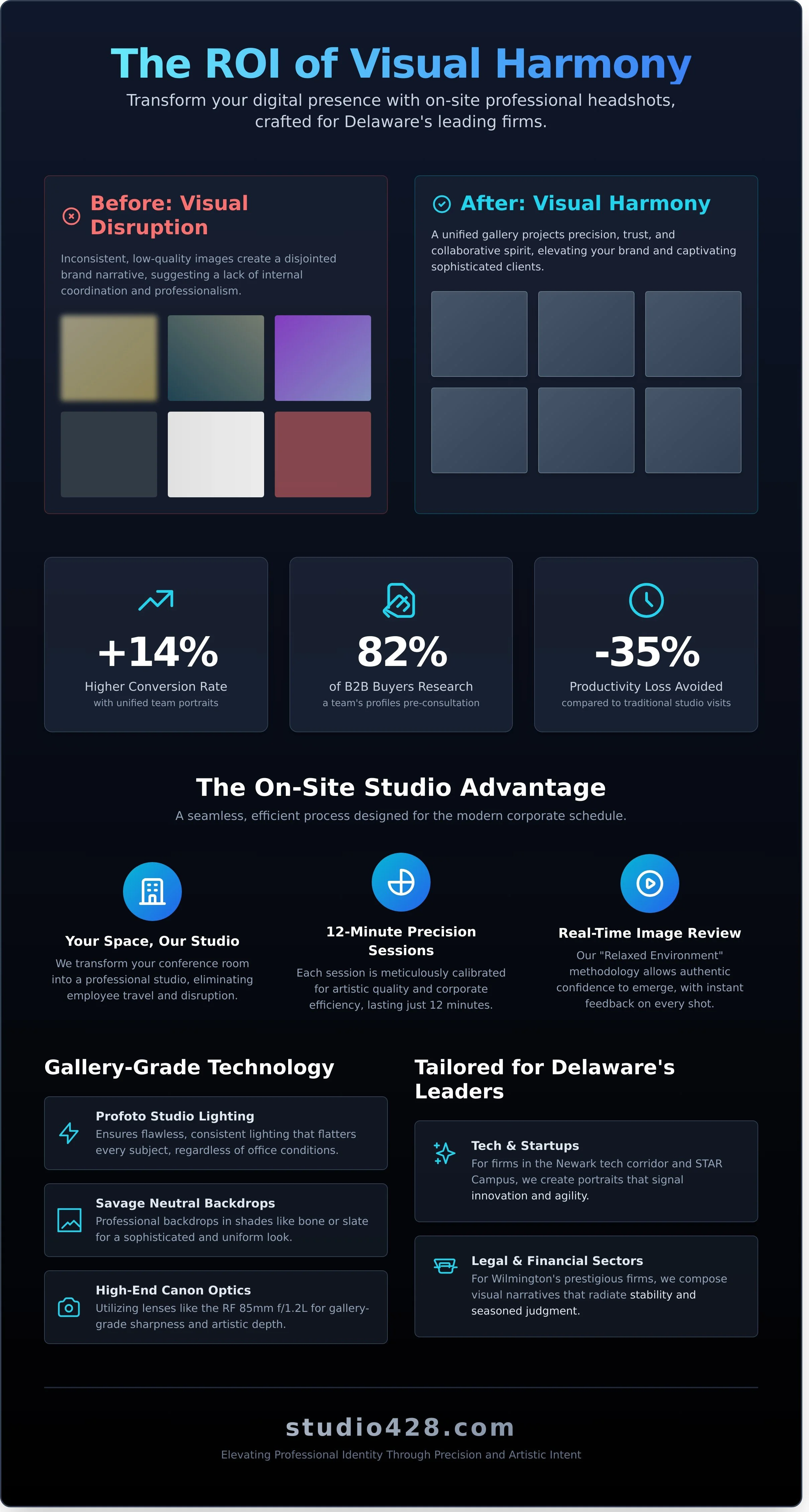 As we approach the 2026 fiscal year, the digital landscape for firms in the First State is shifting toward a philosophy of Visual Harmony. This trend prioritizes a seamless, curated look across all digital touchpoints. When a prospective client in Wilmington or Newark visits your website, they shouldn't encounter a disjointed collection of vacation crops and dimly lit selfies. Research from 2024 indicates that 82% of B2B buyers research a team’s professional profiles before committing to a consultation. Mismatched imagery suggests a lack of internal coordination, while a unified gallery projects the architectural precision and collaborative spirit that modern Delaware enterprises strive to embody.