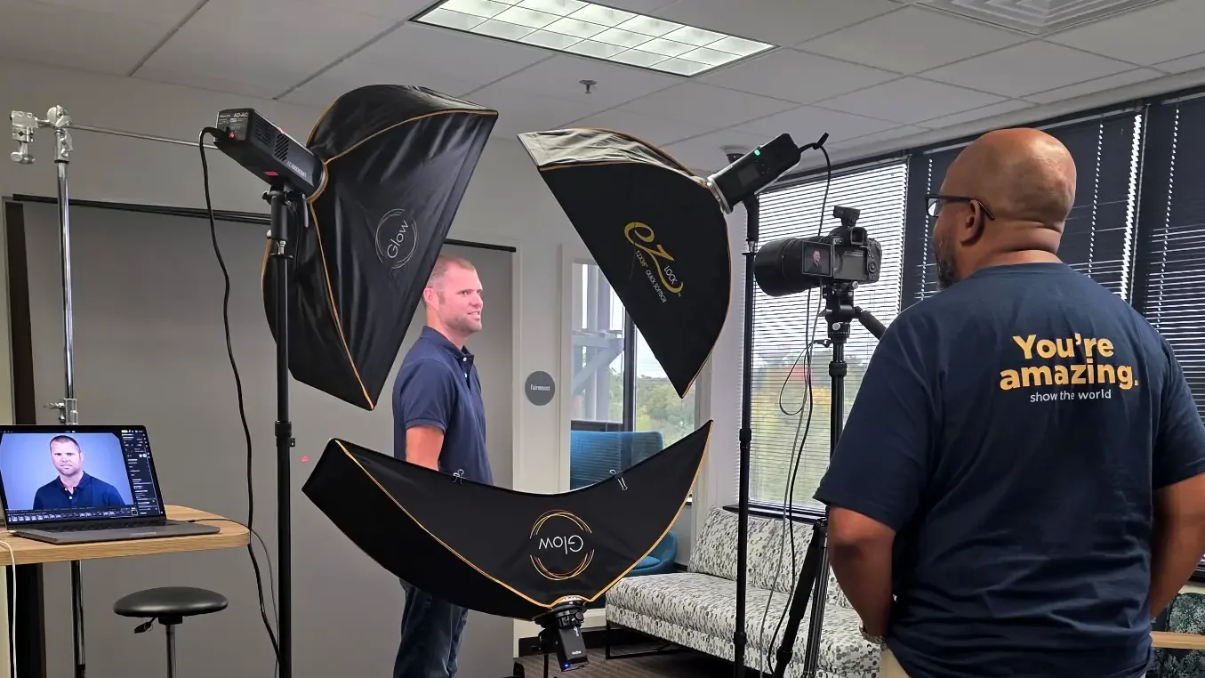 Guiding a CDW team member during their on-site corporate headshot session — coaching poses and expressions to capture confidence and professionalism.
